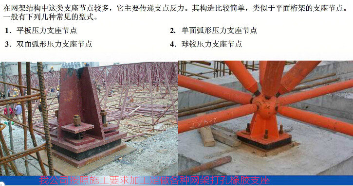 網架橡膠支座的橡膠墊塊由多層橡膠與薄鋼板制成。這種支座不只能夠沿切向及法向位移,還能夠繞兩向轉動,其結構簡略、造價低、裝置方便適用于大、中跨度的網架結構。