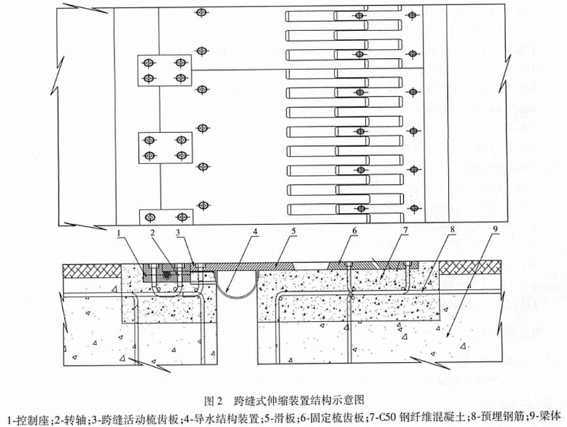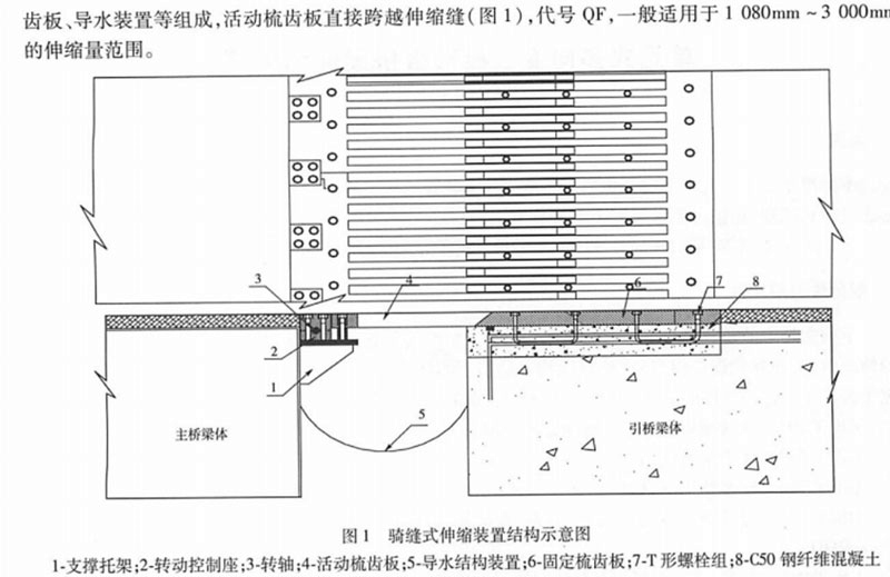 1.多向變位梳齒板式伸縮縫面層板為梳齒形滑槽鋼板,從左右伸出橋面板間隙處相互嚙合的支承式構造,伸縮縫結構剛度較大,較大的水平變位,伸縮量可達42mm。
